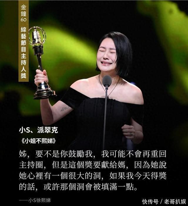 而这次小S终于走了出来,不仅与老搭档蔡康永合体颁奖,更凭借《小姐不熙娣》一举夺得“综艺节目主持人奖”。 在获奖感言中特别感谢姐姐,却将奖杯献给了妈妈,因为“她说我心里有一个很大的洞,如果我今天得奖的话,或许她的洞会填满一点。” 此外,小S还分享自己这些日子的状态,说心里还是空空的,在自己无助的时候,还是想打电话给姐姐大S。 并且小S还坚定地表示,如果大S还在,一定会希望她出席这场盛会。